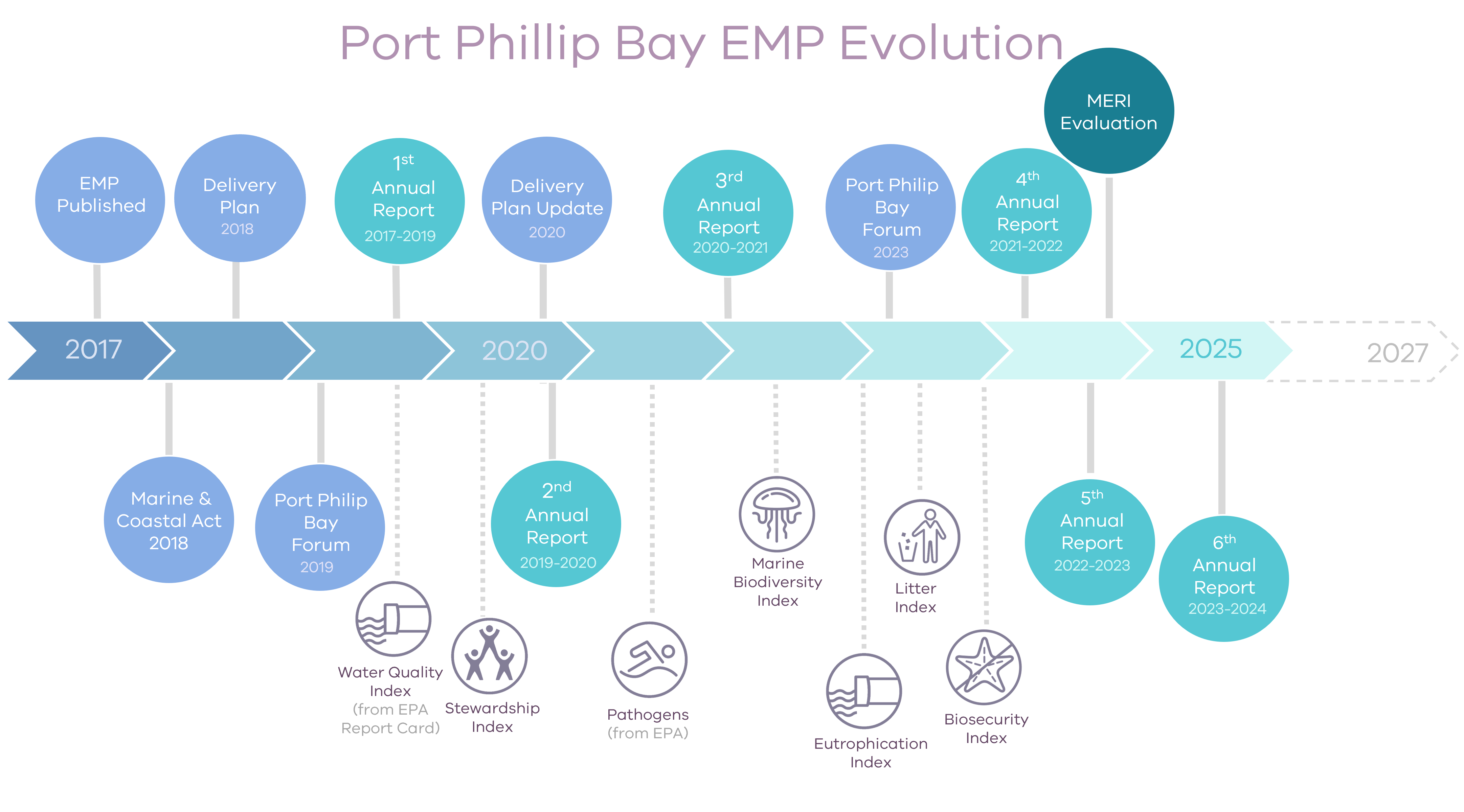 The Port Phillip Bay EMP began in late 2017 and will be implemented over ten years using an adaptive management approach.